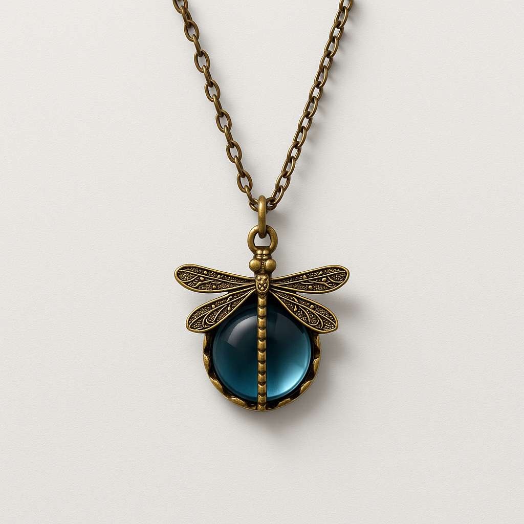 This antique-style necklace features a detailed bronze dragonfly resting on a round blue glass pendant, suspended from a vintage-style chain. Its intricate metalwork and nature-inspired charm make it a distinct accessory for those who appreciate nostalgic jewelry styles.