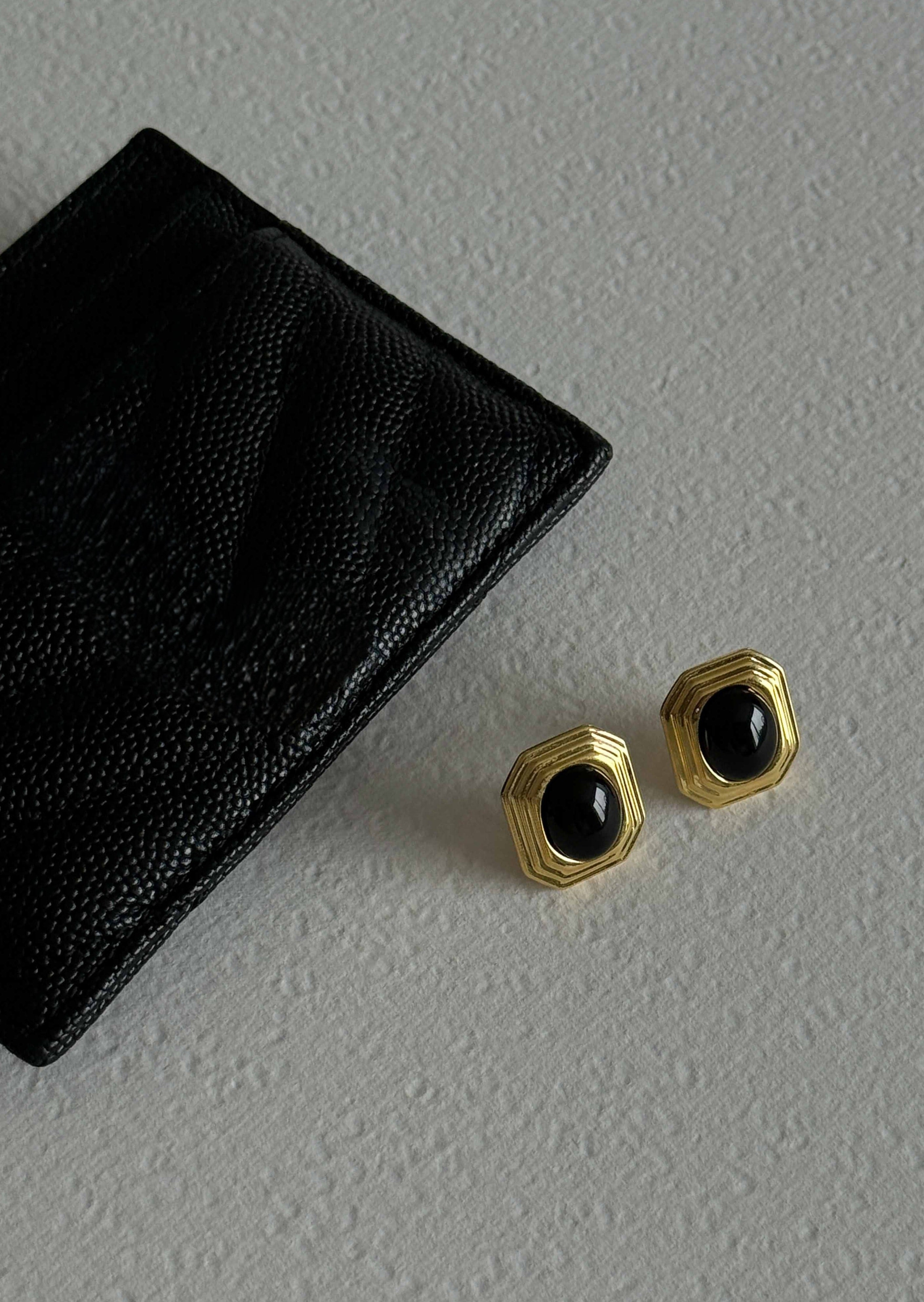 Gold Stud Earrings with Black Oval Center and Geometric Frame