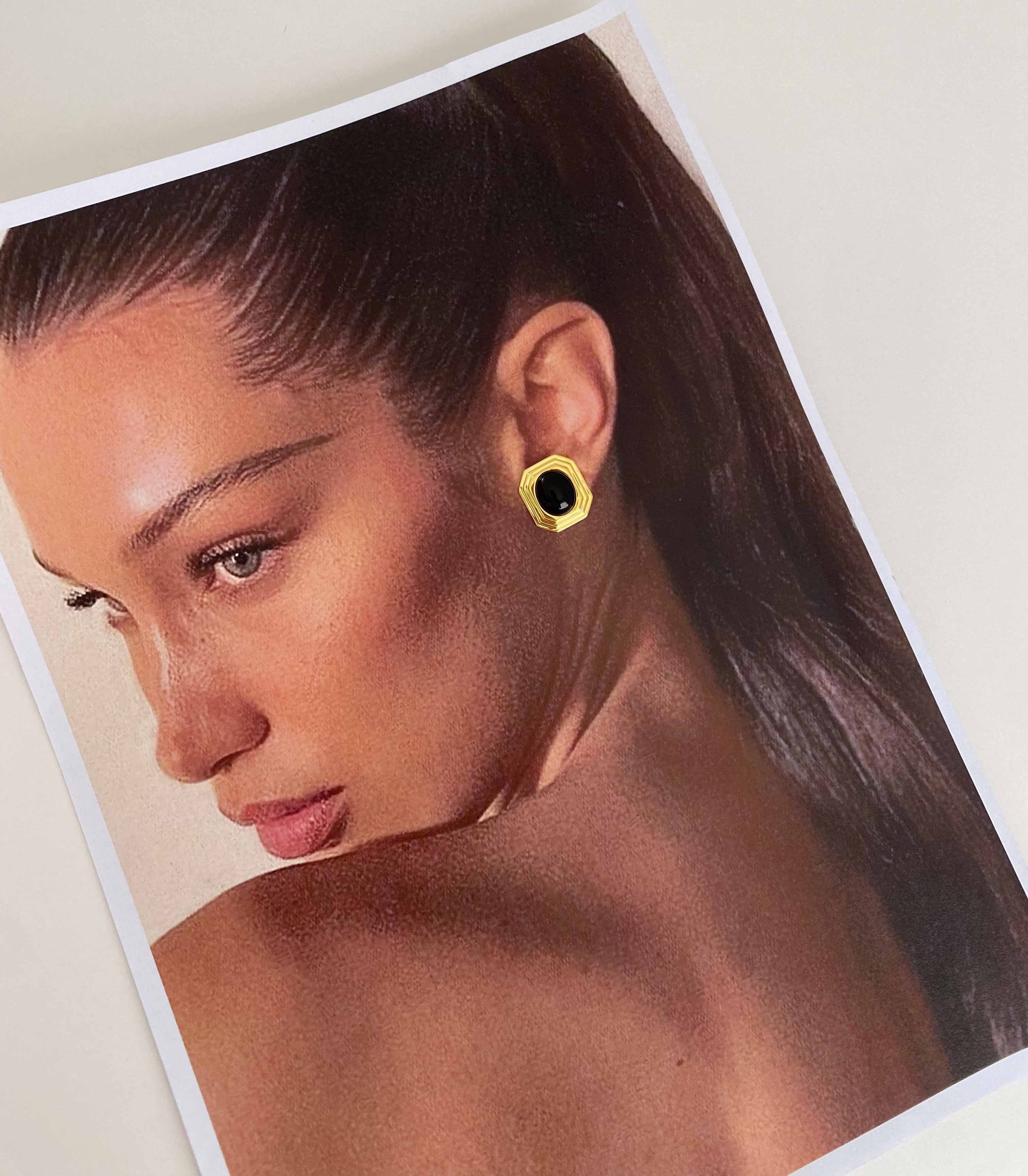 These gold-tone stud earrings feature a bold geometric silhouette with a smooth, black oval centerpiece. The structured design adds a sophisticated, modern edge to any outfit. Ideal for day-to-night styling, these earrings are lightweight and comfortable for everyday wear.