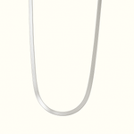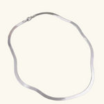 This gold-tone necklace showcases a sleek herringbone chain with a smooth, reflective finish. The flat profile lies elegantly against the skin, offering a sophisticated and modern silhouette. Ideal for solo wear or layering with other chains, this minimalist design adds a polished edge to any outfit.