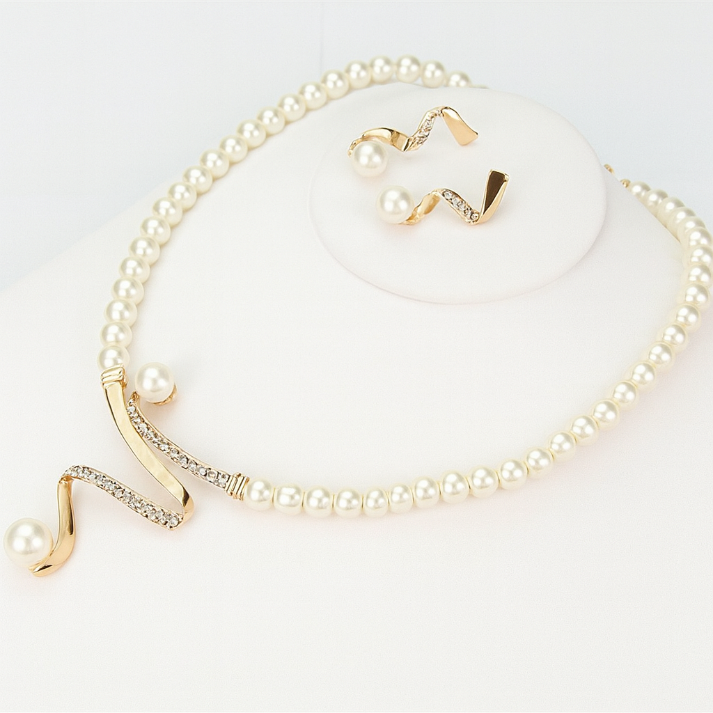 Add a timeless touch to your jewelry collection with this elegant Pearl Necklace and Matching Earrings Set in a luxurious gold tone. Featuring lustrous pearls and a graceful wave-shaped accent adorned with sparkling details, this set perfectly balances classic charm and modern sophistication. Ideal for weddings, formal events, or everyday elegance, it offers a refined finish that enhances any look.