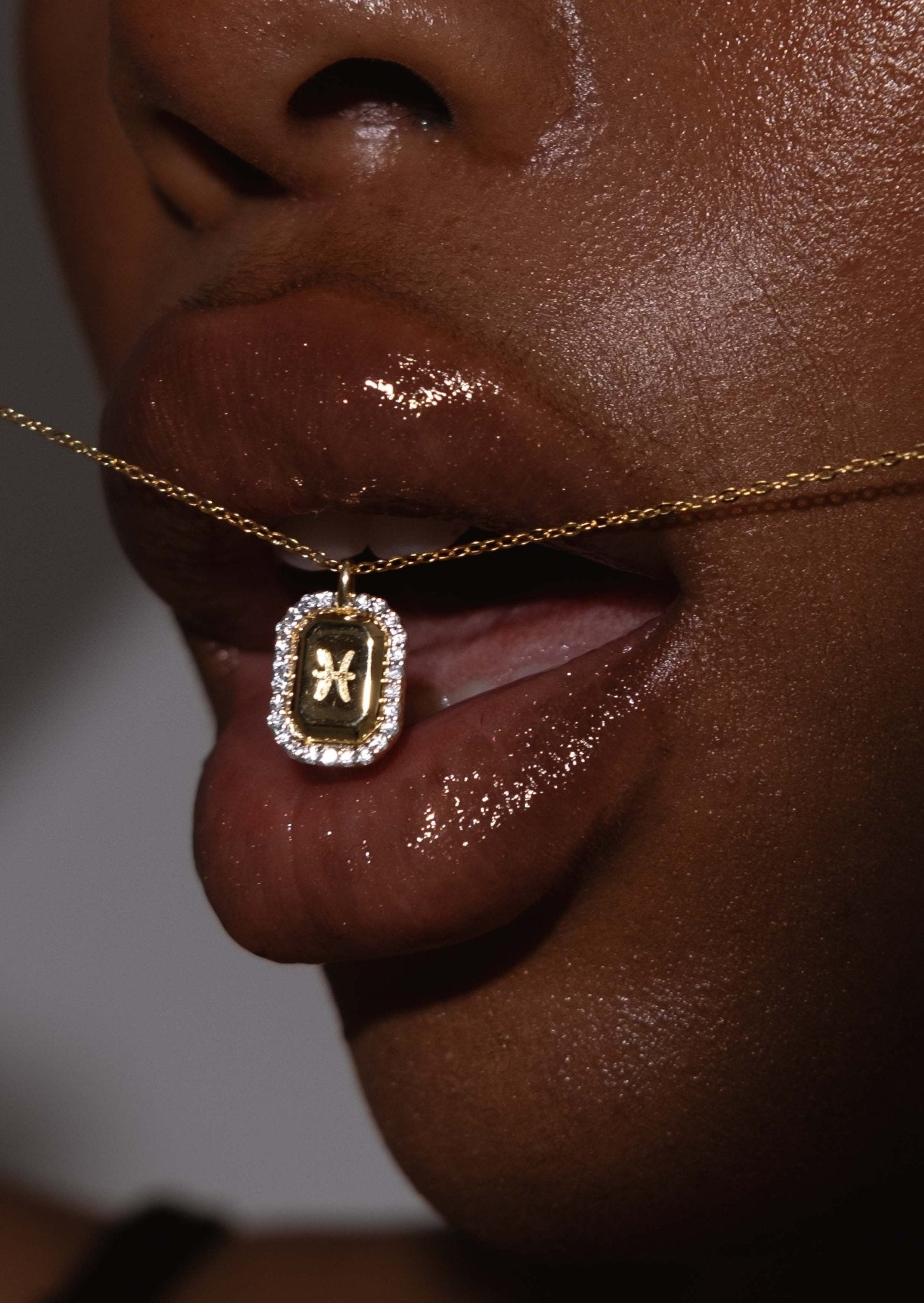This gold-toned necklace features a rectangular zodiac pendant framed by a border of small, clear stones for a refined sparkle. The engraved symbol at the center adds a personal and celestial touch, while the sleek chain ensures an elegant drape. A stylish everyday accessory that pairs beautifully with both layered and standalone looks.