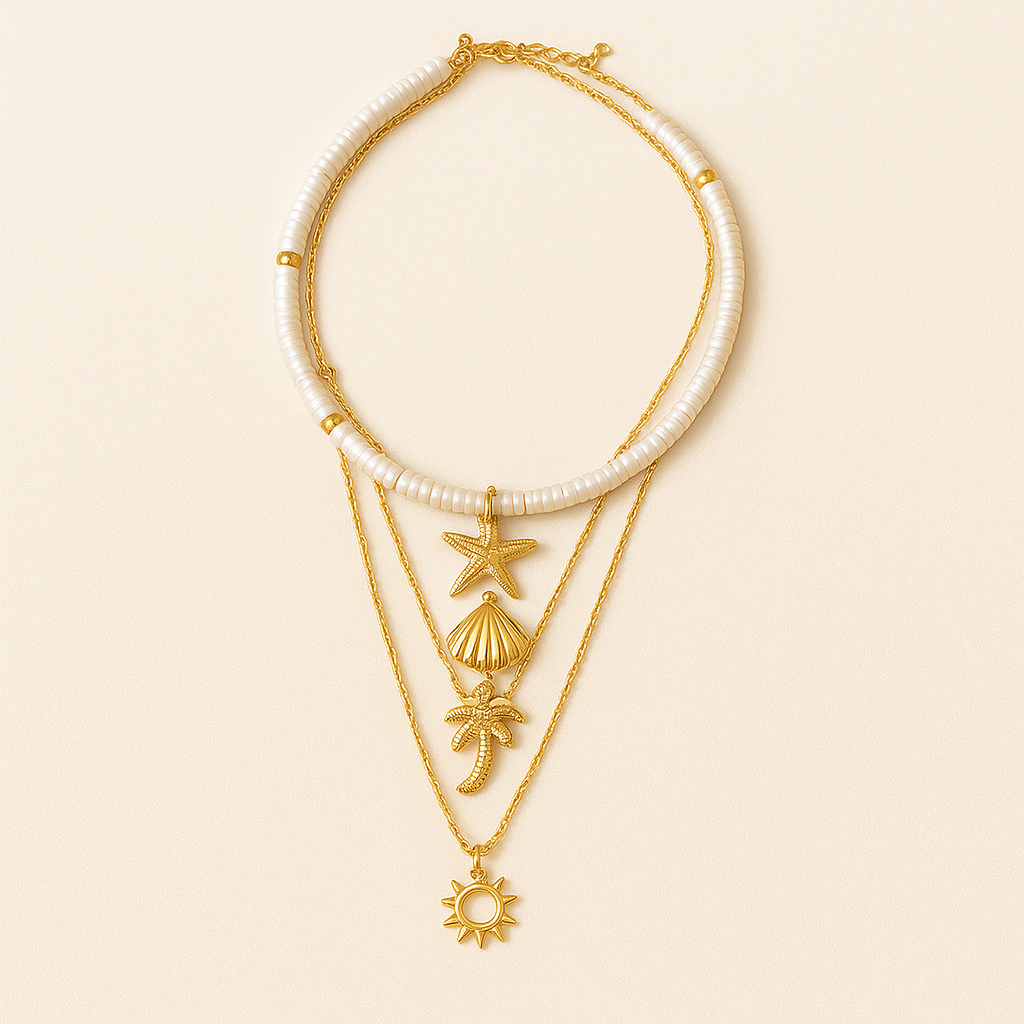 This tropical-inspired layered necklace combines playful elegance with beachside charm. The upper strand features smooth pearl-like disc beads accented with small gold elements. Three cascading gold-tone chains hold detailed pendants—a starfish, seashell, palm tree, and sun—each carefully sculpted for texture and shine. Perfect for summer styling, this necklace brings a touch of coastal sunshine to any outfit and is ideal for layering or wearing as a statement piece on its own.