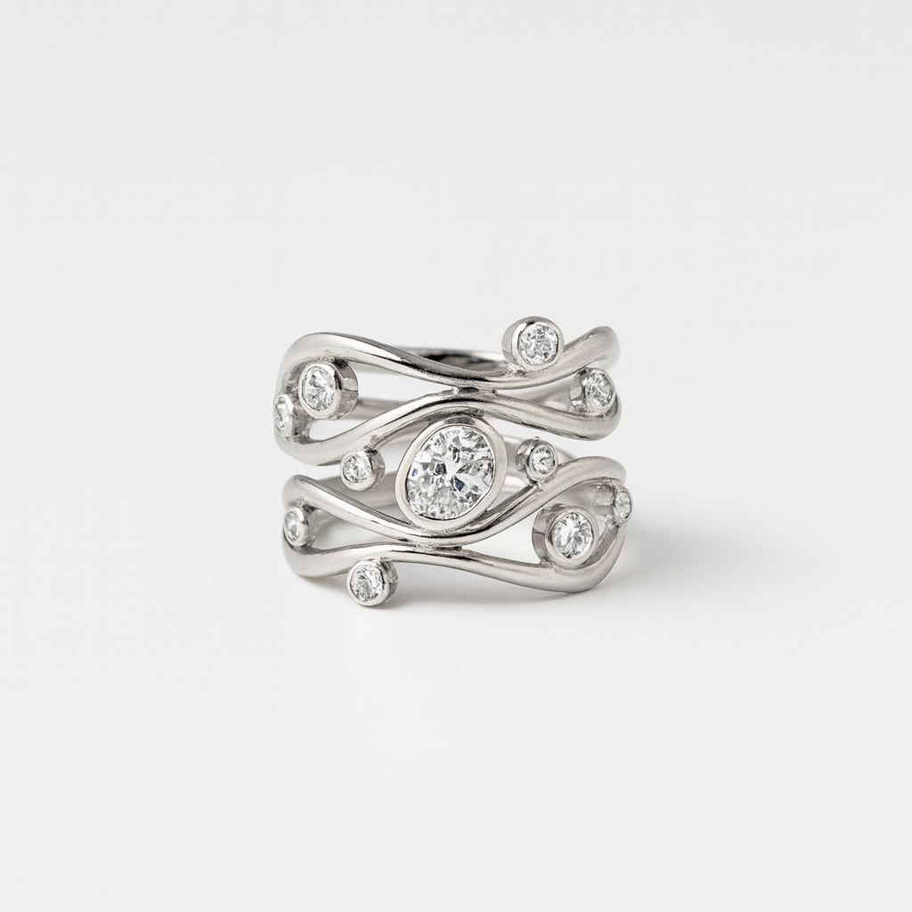 • Brilliant Accents: Finely set zirconia crystals provide a delicate shimmer that highlights the ring's unique structure.