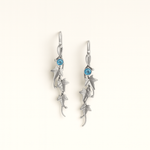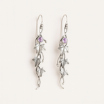 These nature-inspired drop earrings feature intricately crafted silver-toned vines adorned with ivy-shaped leaves and a round gemstone accent at the top. The earrings combine botanical motifs with delicate curves, creating an organic and earthy charm. Available in various gem tones, they make a thoughtful gift or a subtle statement for any outfit.