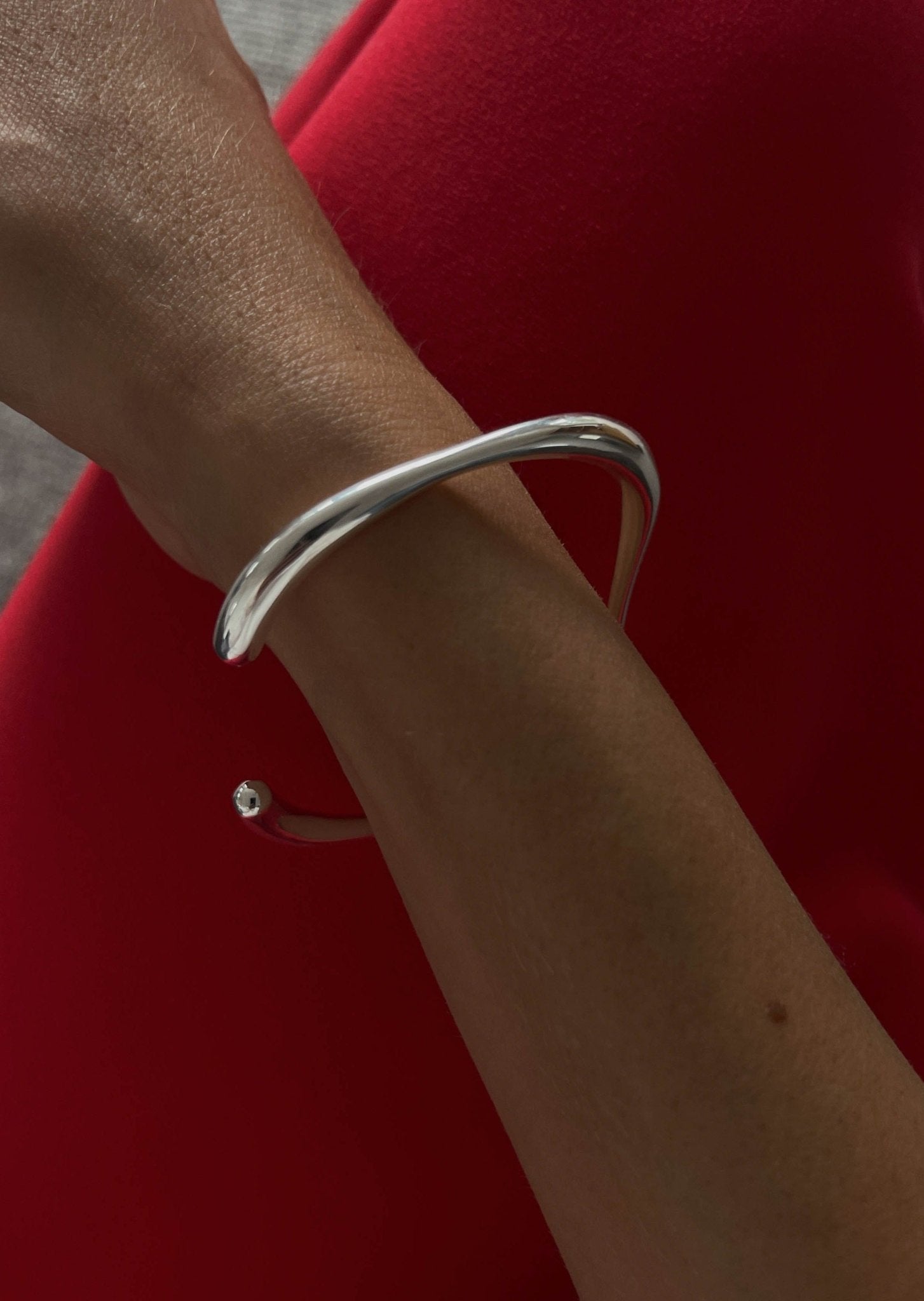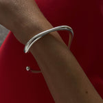 This sleek silver-tone open cuff bracelet features a gentle wave-inspired curve that adds a soft, sculptural element to your look. The polished finish and open design make it easy to slip on and wear solo or stacked with other bangles. A modern, lightweight piece perfect for clean and minimal styling.