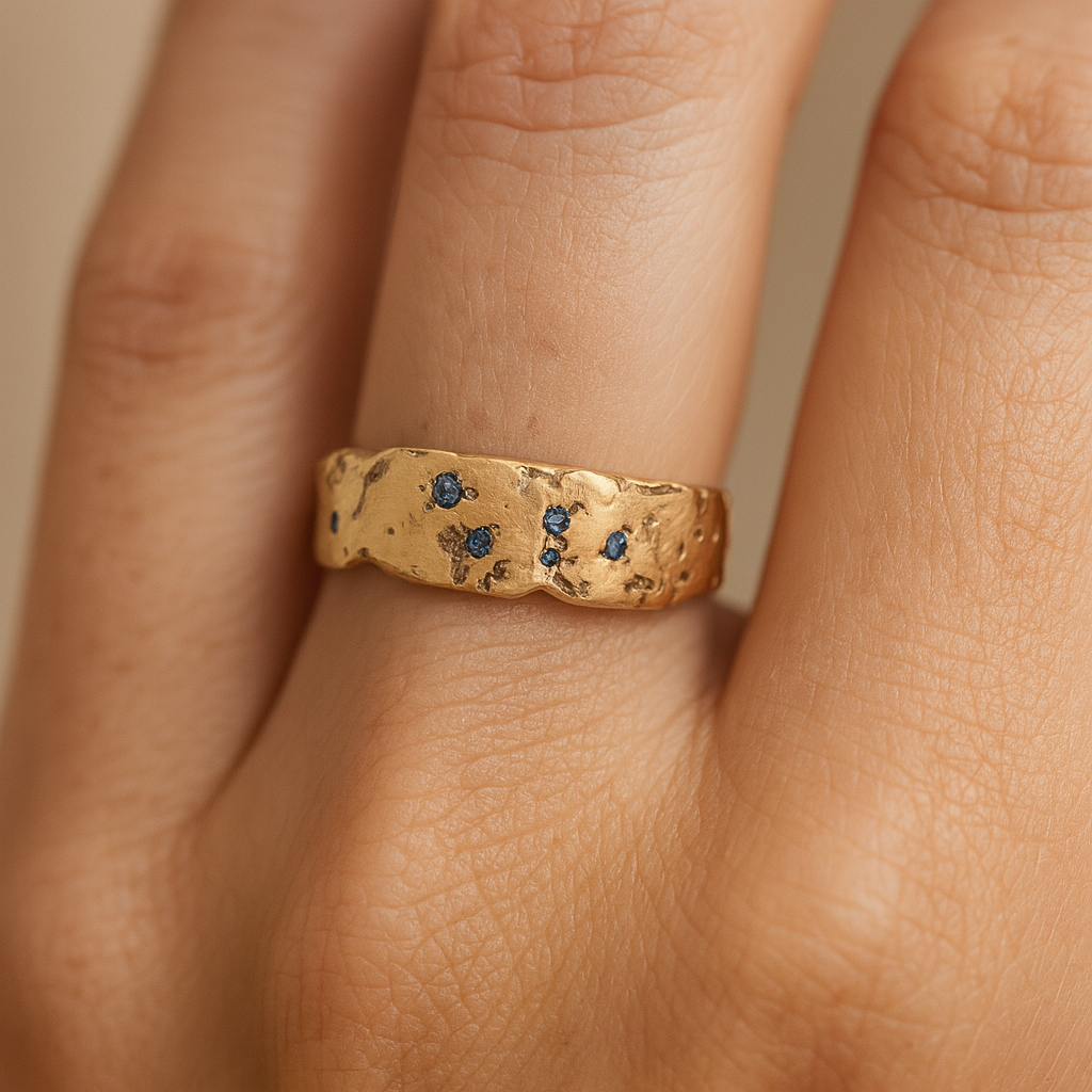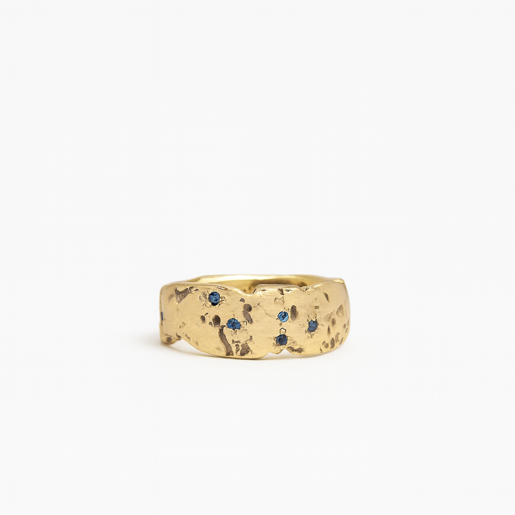 This textured gold-toned ring features organically forged detailing with scattered blue crystal inlays, offering a rugged yet refined appearance. The ring’s uneven surface and dispersed sparkle make it a bold statement piece that pairs well with various outfits and occasions