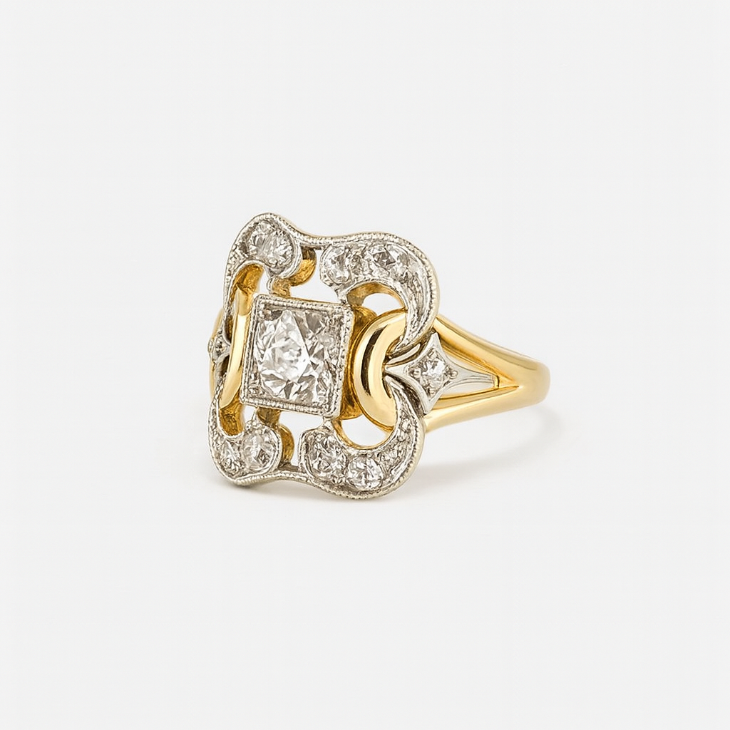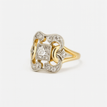 This ring features a vintage-inspired setting with clear round zirconia stones set in an ornate openwork design. The gold-toned band complements the silver-toned accents and detailed shapes, offering a refined appearance that suits various occasions.