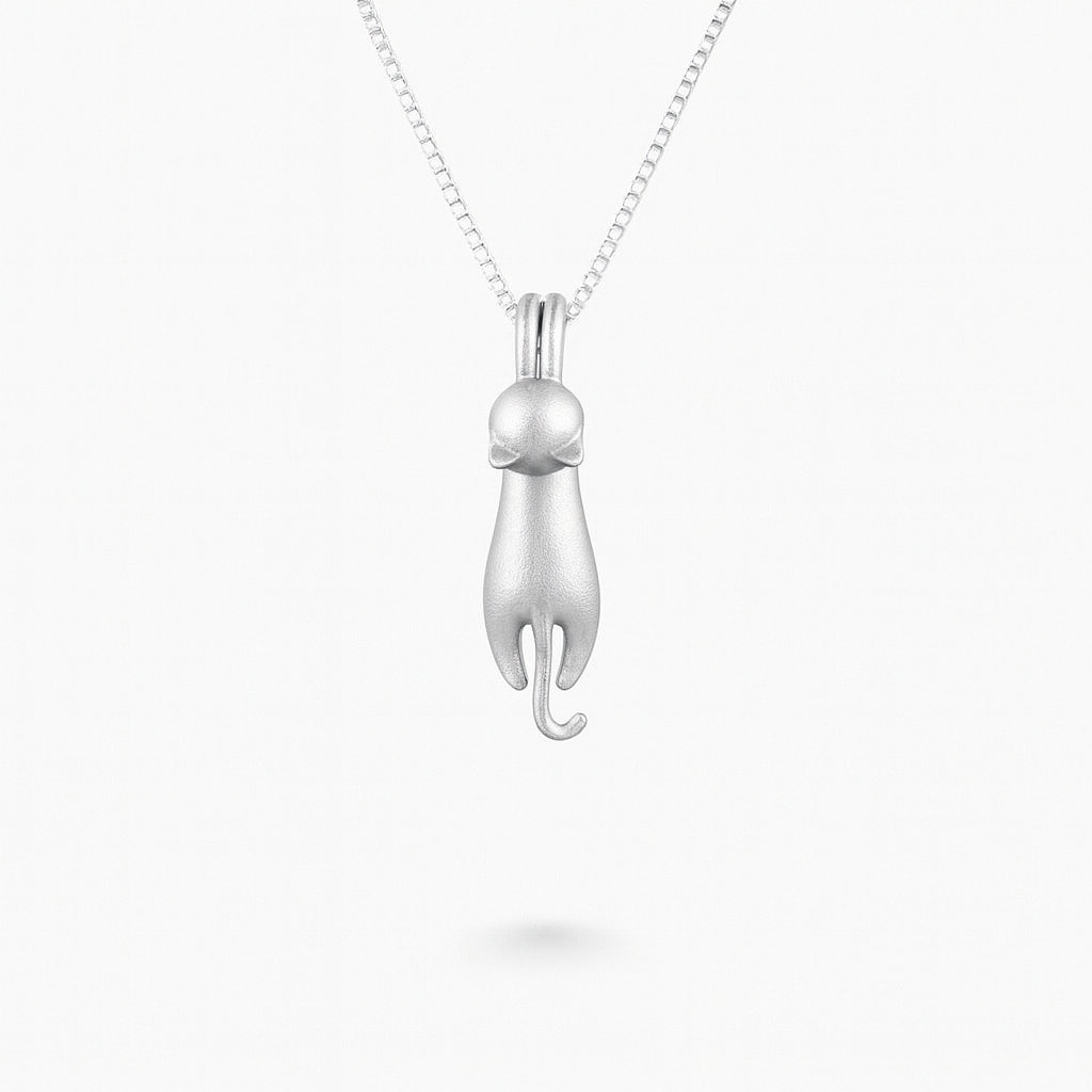 Stretching Cat Pendant Necklace in Matte Silver Tone