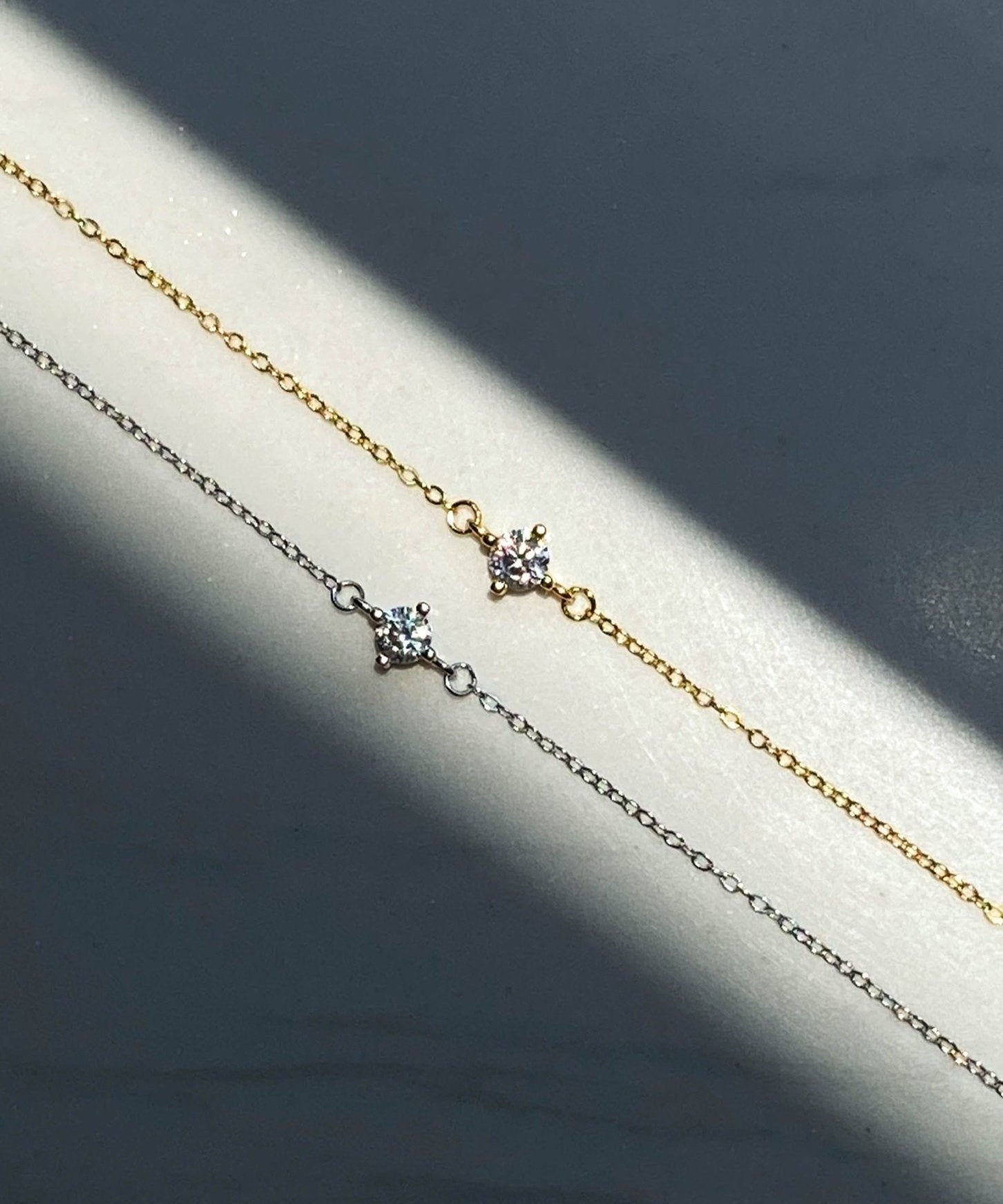 Silver Solitaire Bracelet - Round Center Zirconia - Polished Silver Tone