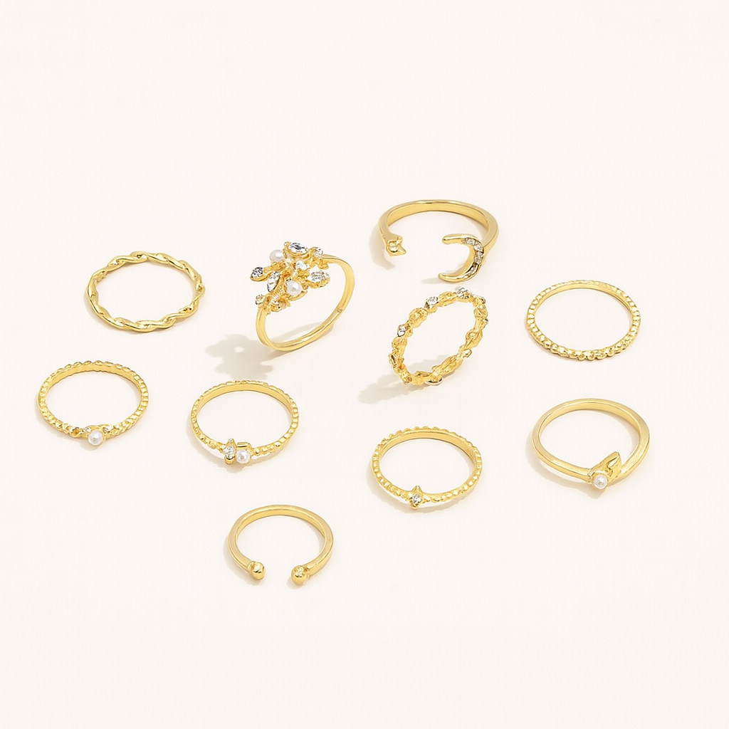 Gold Tone Boho Ring Set with Decorative Crystal Details