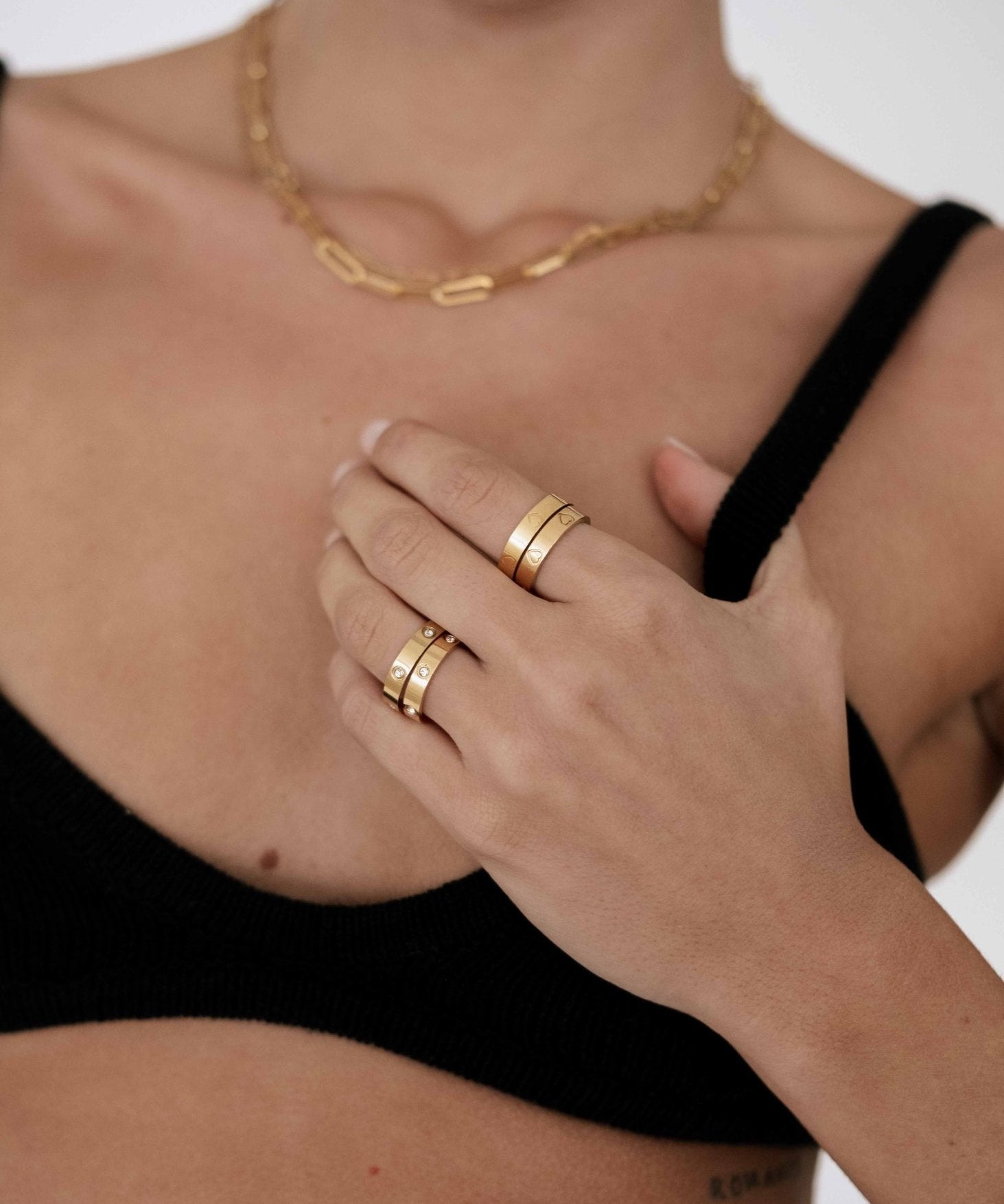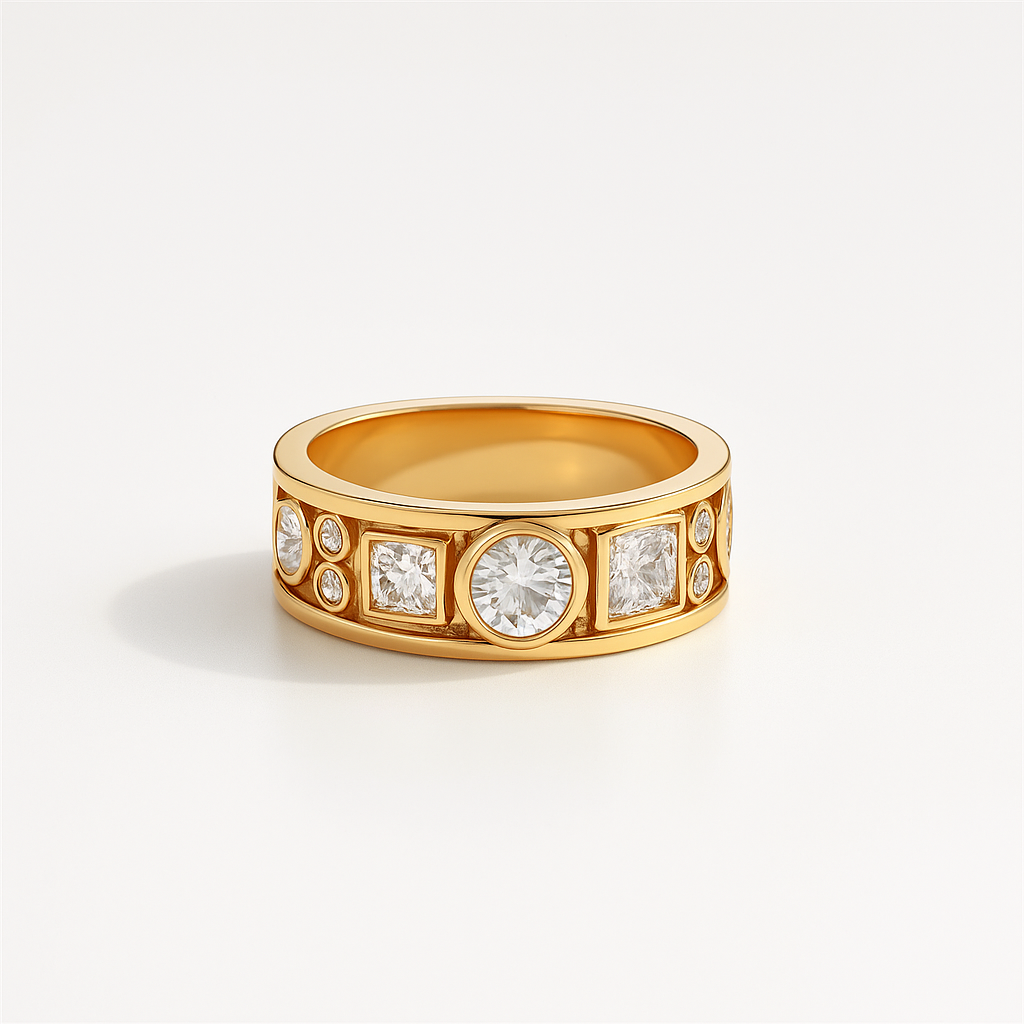 Gold Tone Band Ring with Geometric Zirconia Inlay Pattern