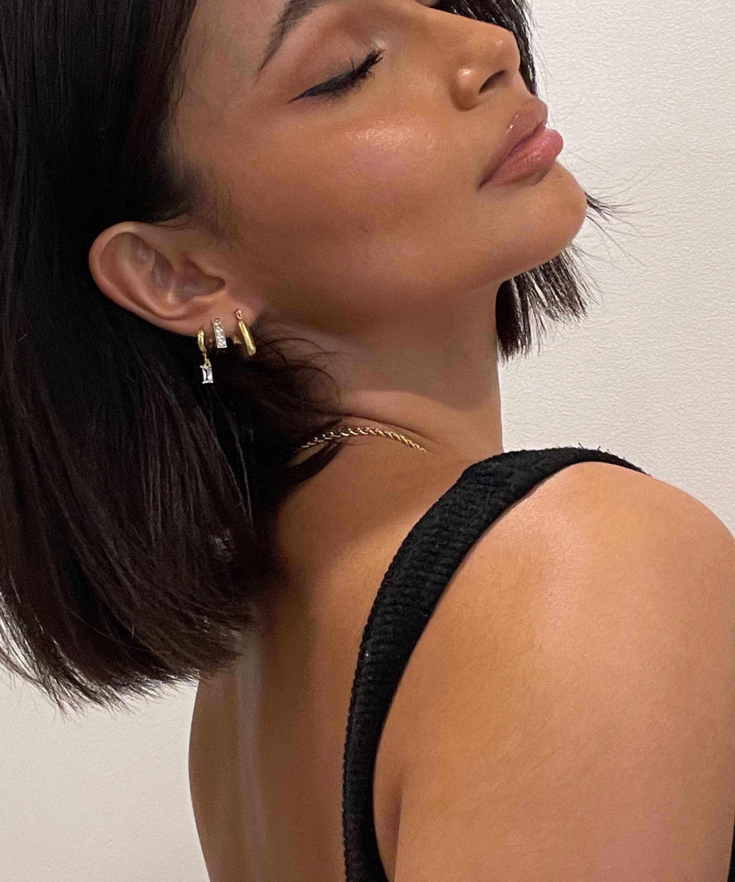 Gold Tone Hoop Earrings with Clear Baguette Charm