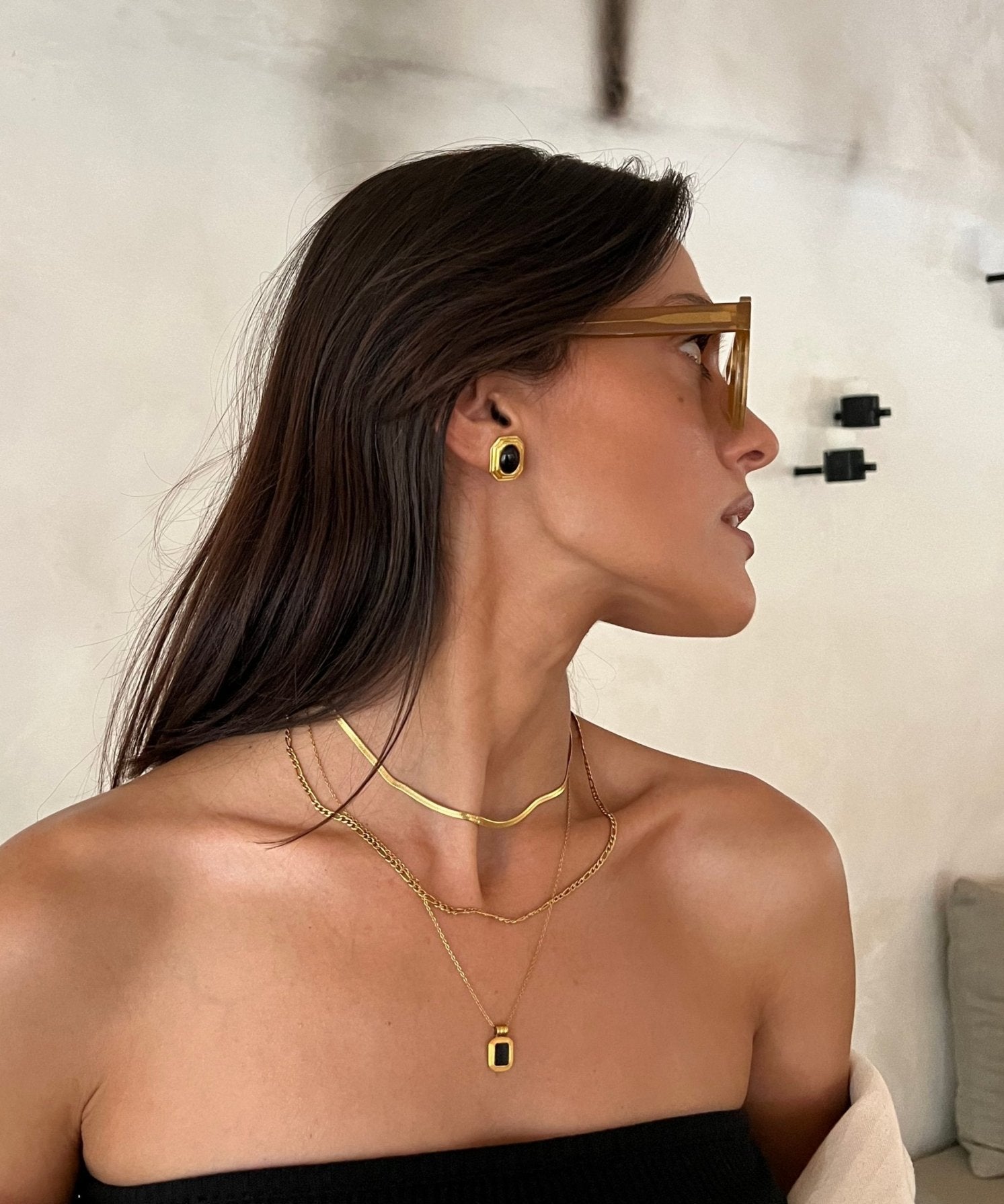 Gold Stud Earrings with Black Oval Center and Geometric Frame