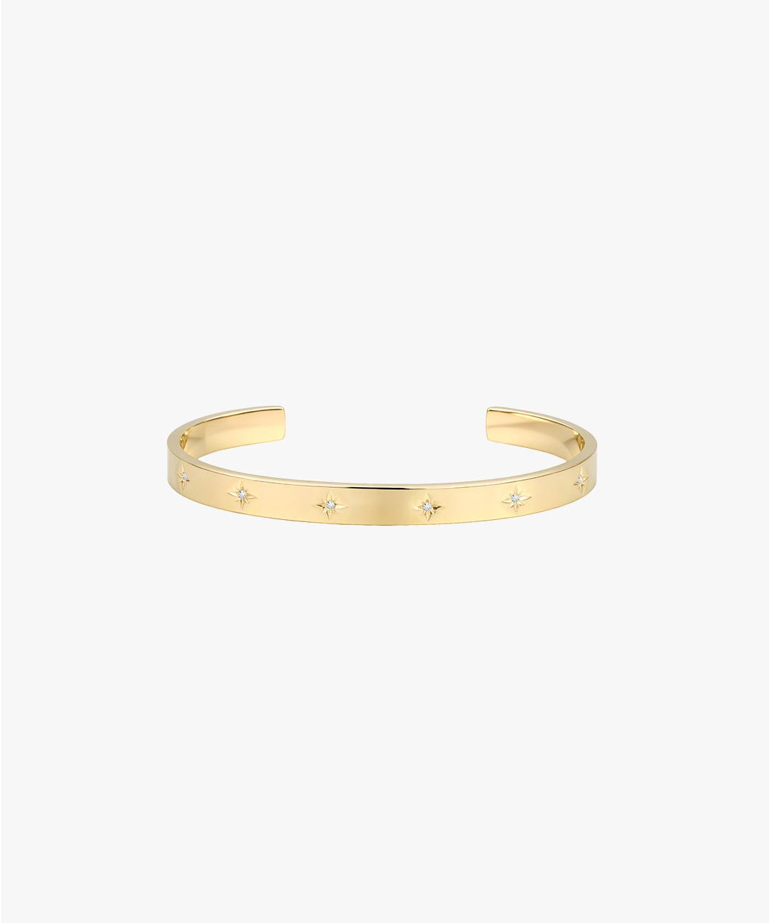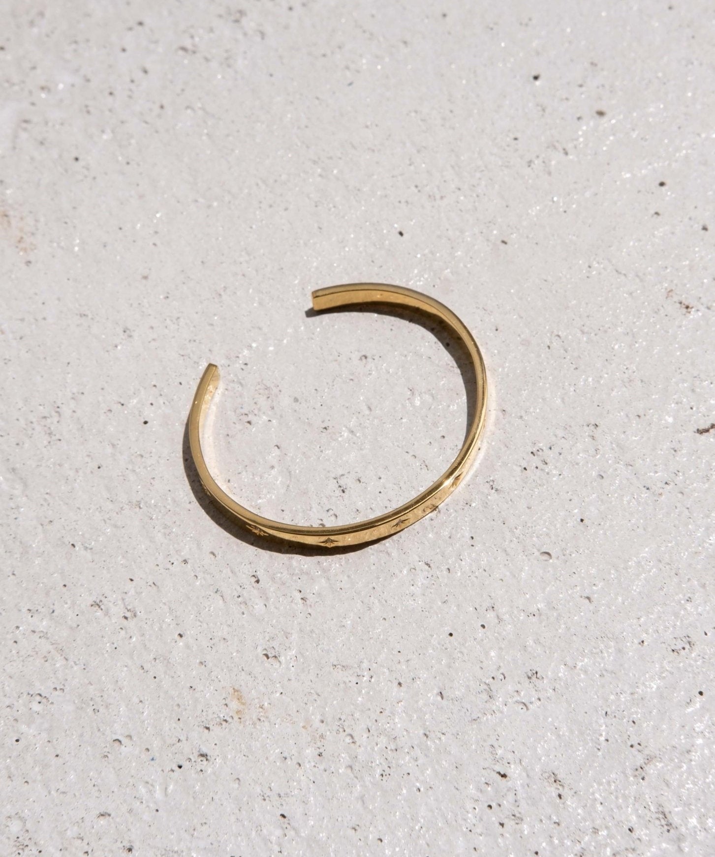 Gold Tone Band Ring with Star Pattern and Small Clear Stone Details