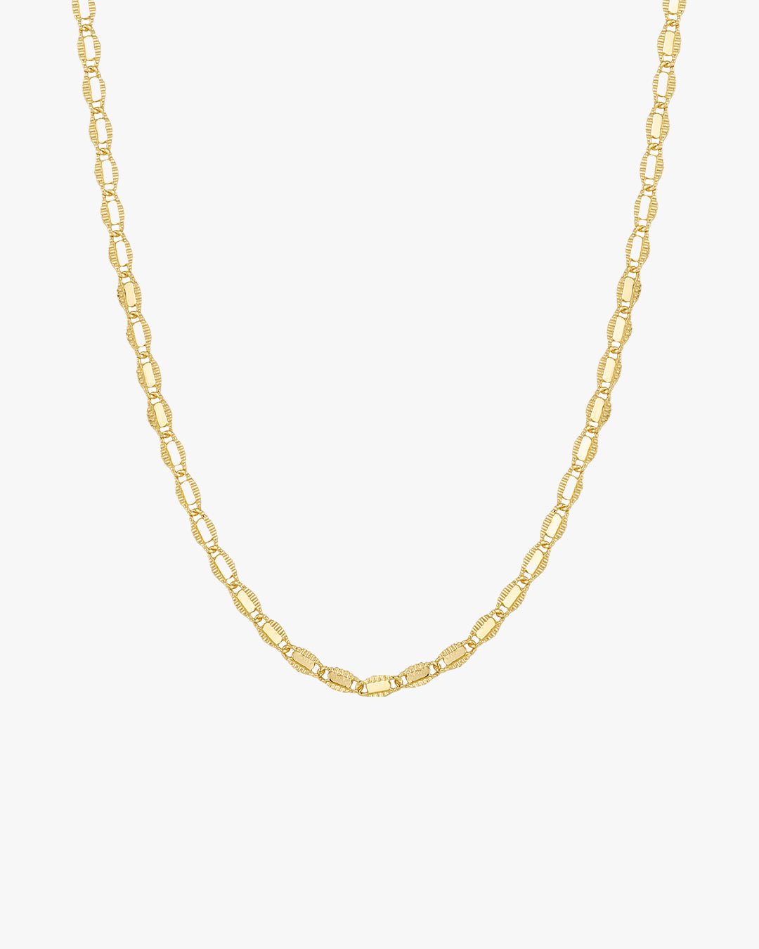 This necklace showcases a sequence of oval-shaped links with a distinctive ribbed texture and polished gold-tone finish. The alternating light reflections on the grooved surfaces add visual interest and a touch of refinement to its structured silhouette. Its bold yet elegant character makes it perfect for both layering and solo wear, effortlessly complementing casual daytime looks or elevated evening outfits. A timeless design with a twist, ideal for those who appreciate subtle detail.