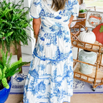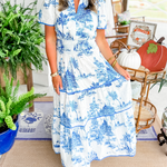 This women’s tiered vintage print maxi dress is designed with a flowing structure suited for spring days and planned occasions. the classic toile-inspired pattern paired with a tiered silhouette creates a refined look that works well for gatherings, outings, or daytime events. the maxi length allows smooth transitions from casual daytime plans to more styled settings.