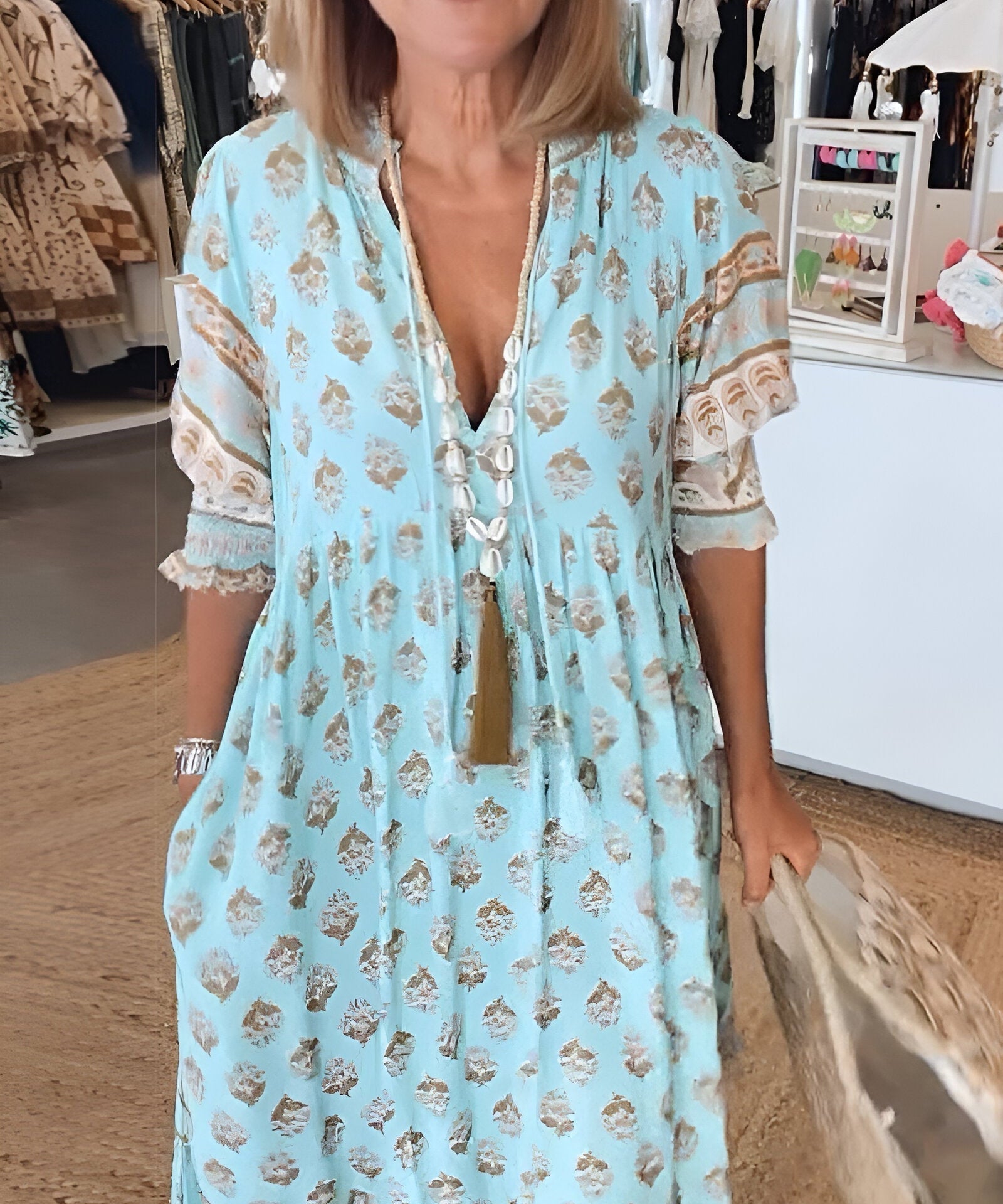 Women's V Neck 3/4 Sleeves Boho Style Dress | Maxi