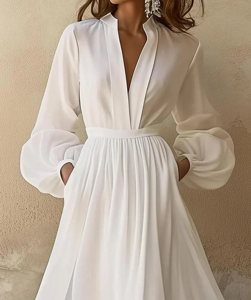 Women's V-neck Flared Summer Dress with Long Sleeve | Maxi