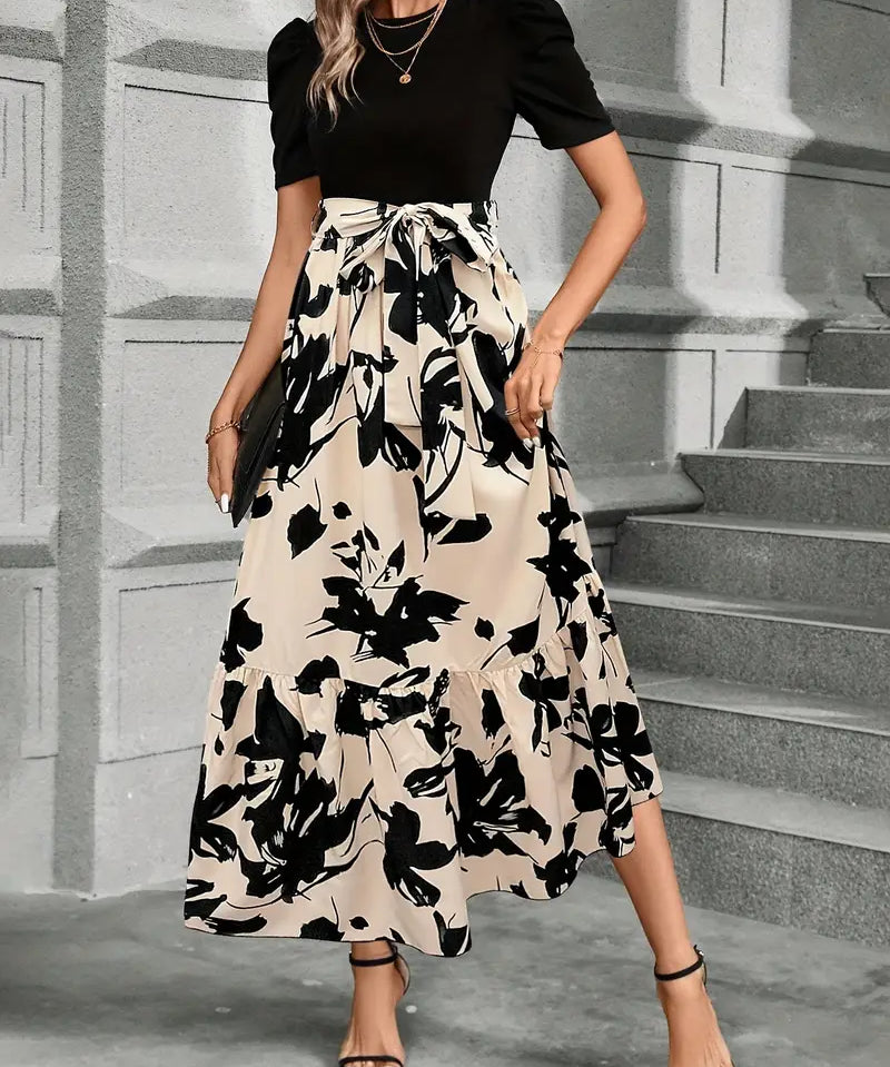 Women's Short Sleeve Round Neck Evening Dress with Bow Tie Waist | Maxi