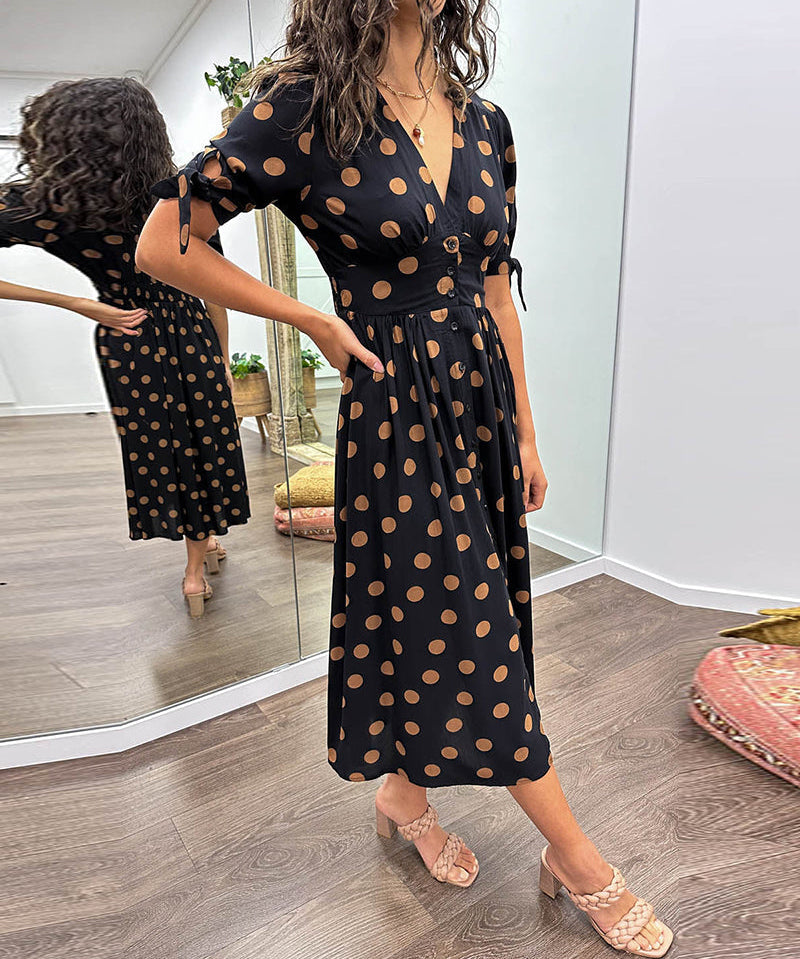 Women's 3/4 Sleeves V-Neck Polka Dot Flared Dress | Midi