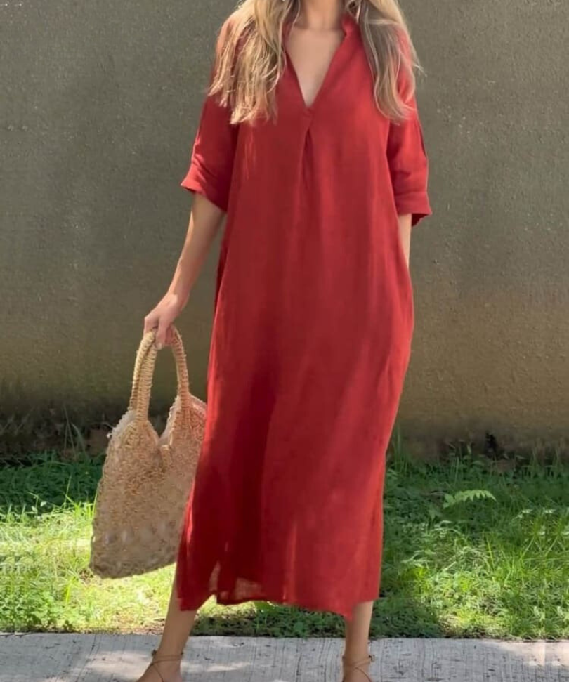 Women's Relaxed Fit 3/4 Sleeves V Neck Summer Dress | Midi
