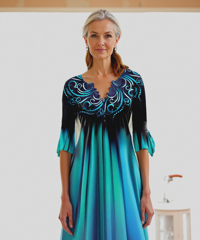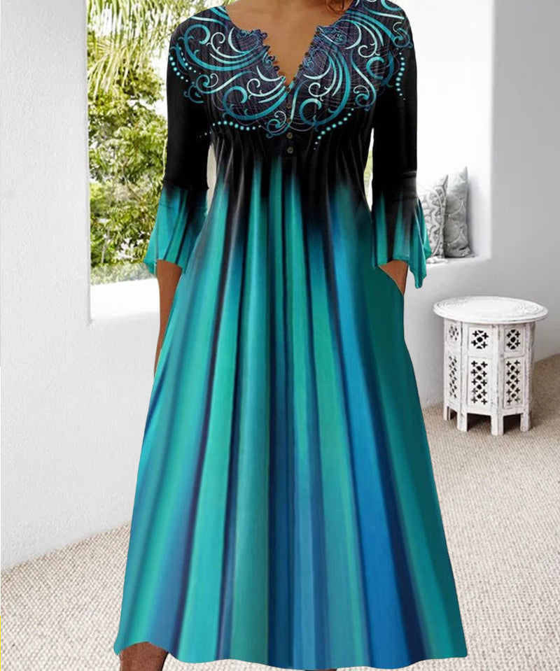 Women's Gradient Design Dress with Split Neckline & 3/4 Sleeves | Midi
