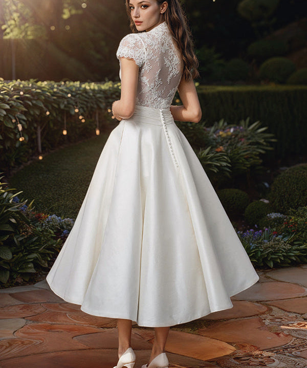 Women's Short Sleeves V Neck White Wedding Dress | Midi