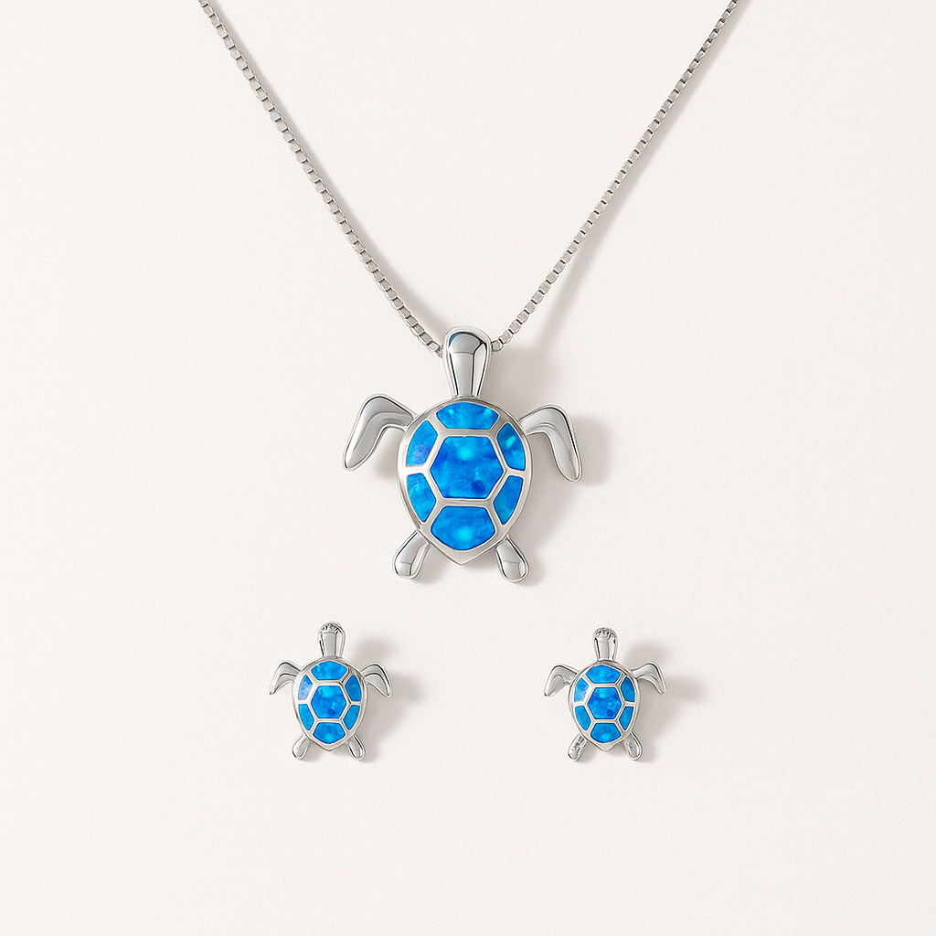 Capture the essence of coastal luxury with the Silver Sea Turtle Jewelry Set. This coordinated set features a detailed turtle motif and a polished silver finish, evoking the feeling of a sun-drenched beach retreat.