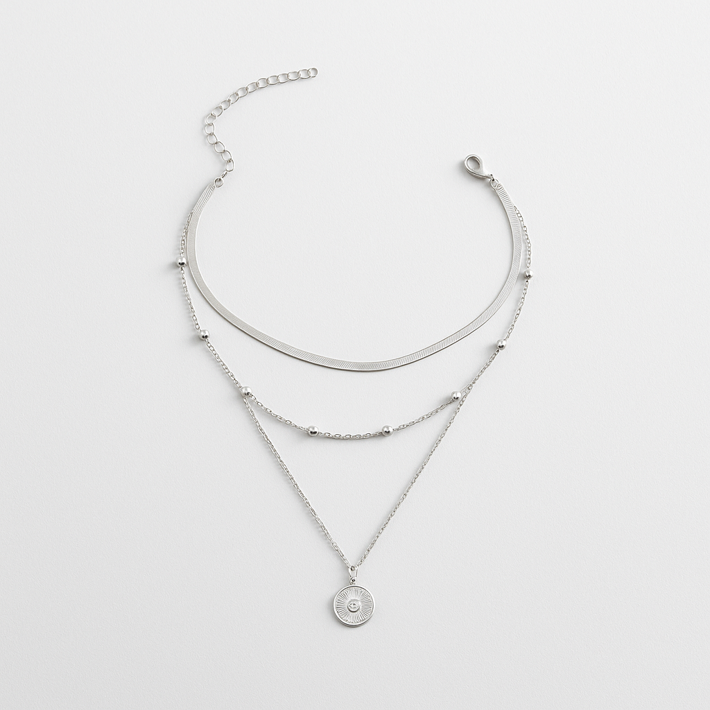 Experience the art of effortless layering with the Silver Triple Chain Medallion Necklace. This architectural piece offers a pre-styled, stacked look that embodies the "Quiet Luxury" aesthetic with a modern, cool-toned edge.