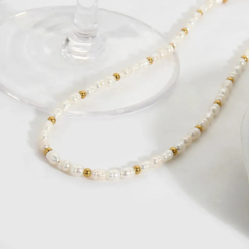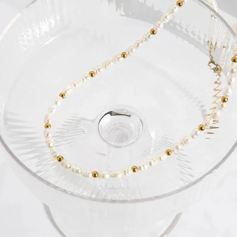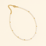 This refined choker features small white beads with a subtle iridescent finish, delicately interspaced with polished gold-tone accents. The adjustable gold-tone clasp ensures a comfortable and secure fit. Perfect for layering or wearing solo, this lightweight necklace adds a soft, elegant touch to both everyday and dressy outfits.