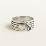 This wide silver-tone band features a textured surface and layered spinner-style design. A central heart accent is complemented by two small round stones, offering a distinctive and structured look. The combination of hammered detailing and clean, rounded edges creates visual interest, suitable for both daily use and styling versatility.