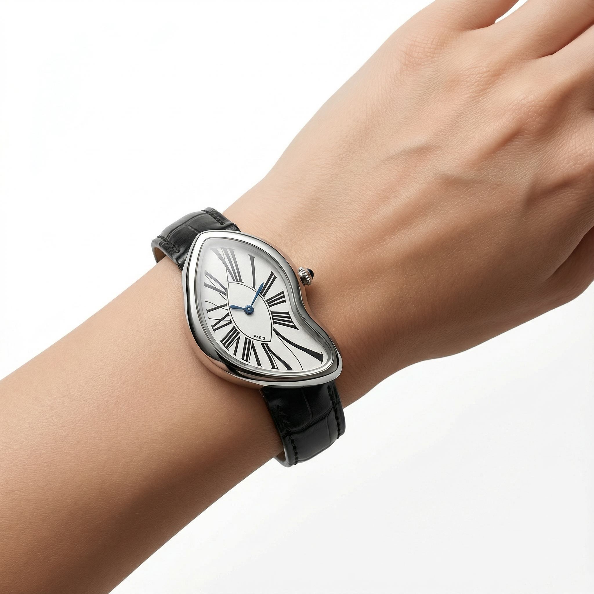 Legacy 'Surrealist' Melted Watch - Silver Stainless Steel Tone - Asymmetric Avant-Garde Design - Black Leather Strap - Waterproof
