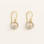 These earrings feature a blend of warm and cool tones, with a circular silver-toned centerpiece accented by a small zirconia set in a gold-tone bezel. The drop hook design adds movement, while the open circle style gives them a minimal yet thoughtful touch. Their mixed-metal look allows them to pair easily with a variety of outfits.