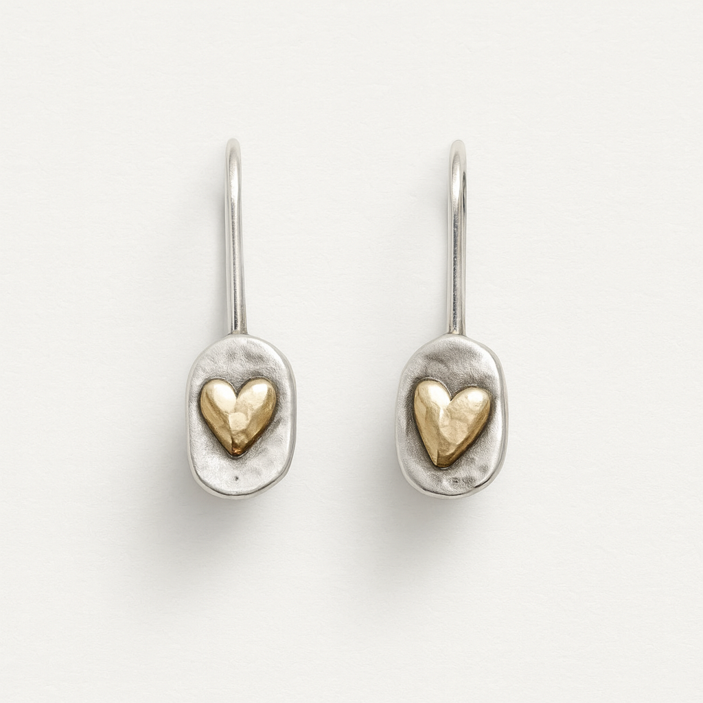 These silver drop earrings feature a lightly hammered finish with a warm-toned heart accent at the center. Designed with a simple curved hook, they offer a subtle two-tone contrast suitable for casual or everyday wear.