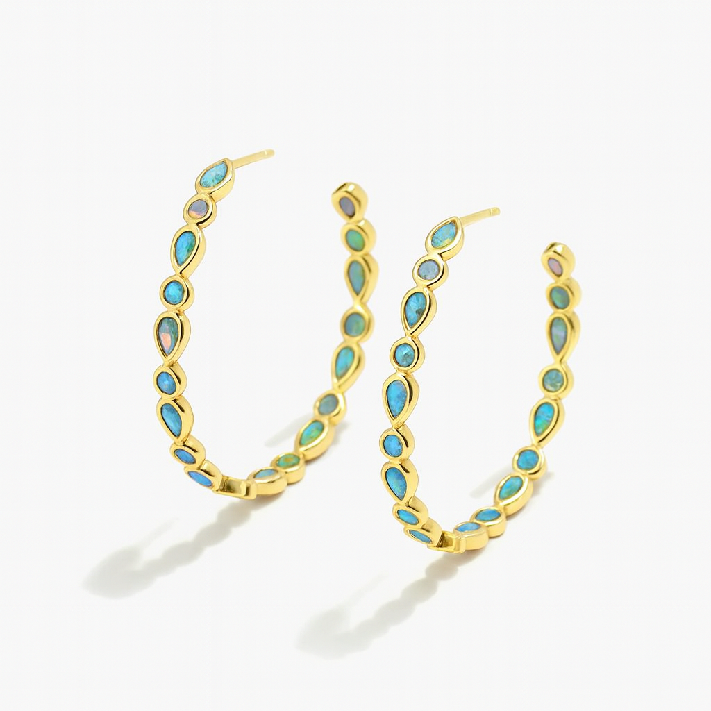 These hoop earrings feature blue opal-style stones set in a gold tone frame arranged in teardrop and oval shapes. Their design offers a colorful, eye-catching style suitable for both everyday wear and special occasions.