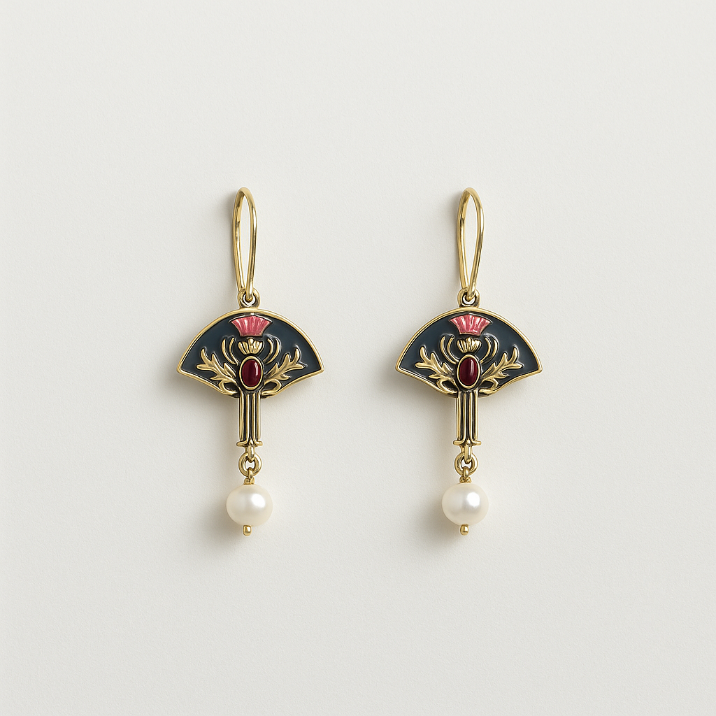 These vintage-style fan-shaped earrings are adorned with detailed gold-tone leaves, a deep red crystal centerpiece, and a hanging faux pearl for added charm. The intricate detailing and artistic finish bring out a timeless character suitable for both casual and formal styling. A secure clasp ensures a snug fit, while the unique combination of elements makes them a distinctive addition to any accessory collection.